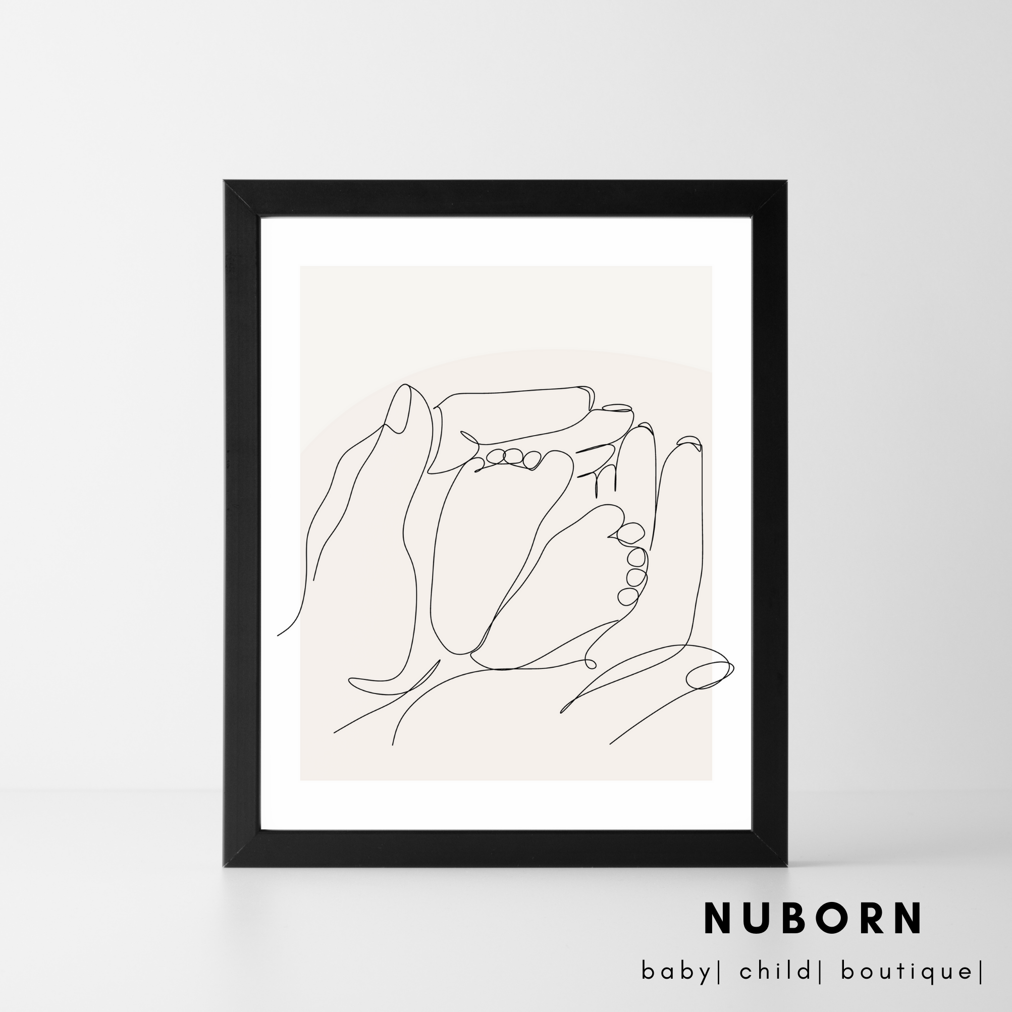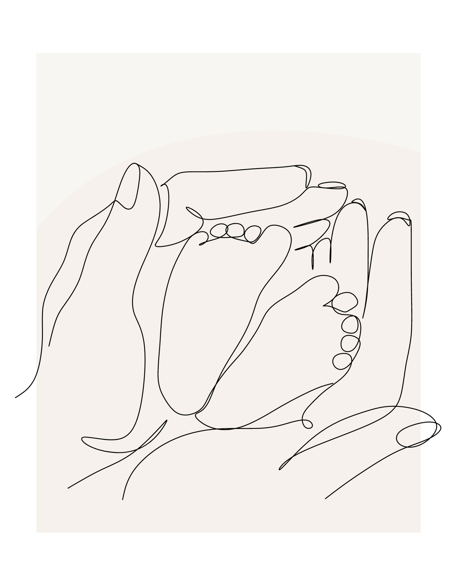 A modern line drawn illustration of an infant's feet being held by hand's- finished with a neutral toned backdrop.